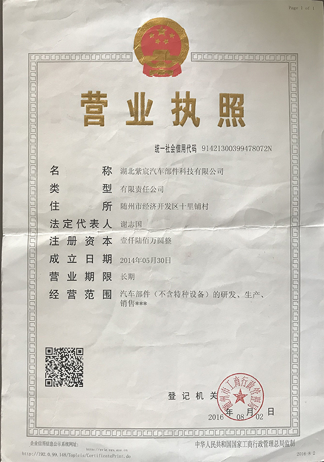 2014年,公司重新注資注冊成立“湖北紫宸汽車部件科技有限公司“。 2014年中,公司進入改裝車行業(yè),產(chǎn)品涉及液壓配件,業(yè)務(wù)涉及掃路車,高空作業(yè)車,消防車,清障車,吸污車,水車,罐車等極大部分特種改裝車型。